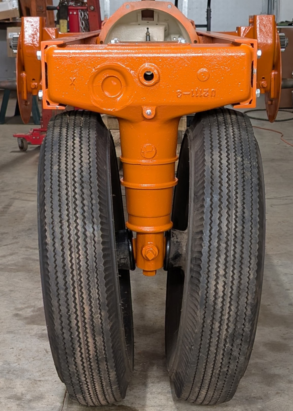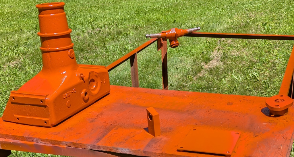 Suspended from the loader it's rolled out for a coat of paint