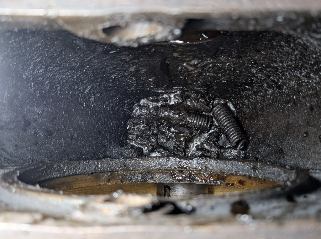 Both sides were filled with old goo, the right side also had 3 remnants of attempts at brake springs