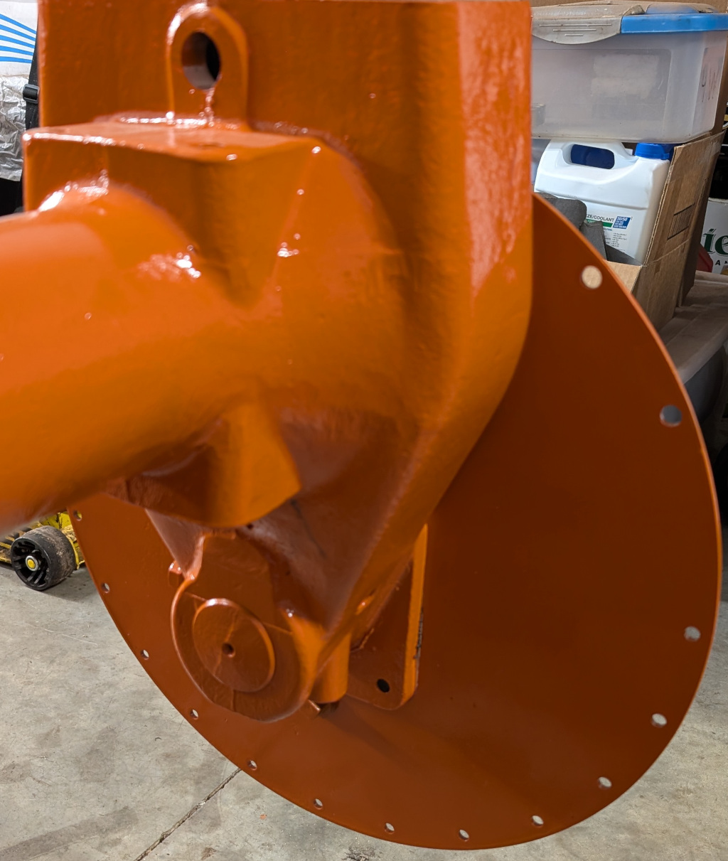 Suspended from the loader it's rolled out for a coat of paint