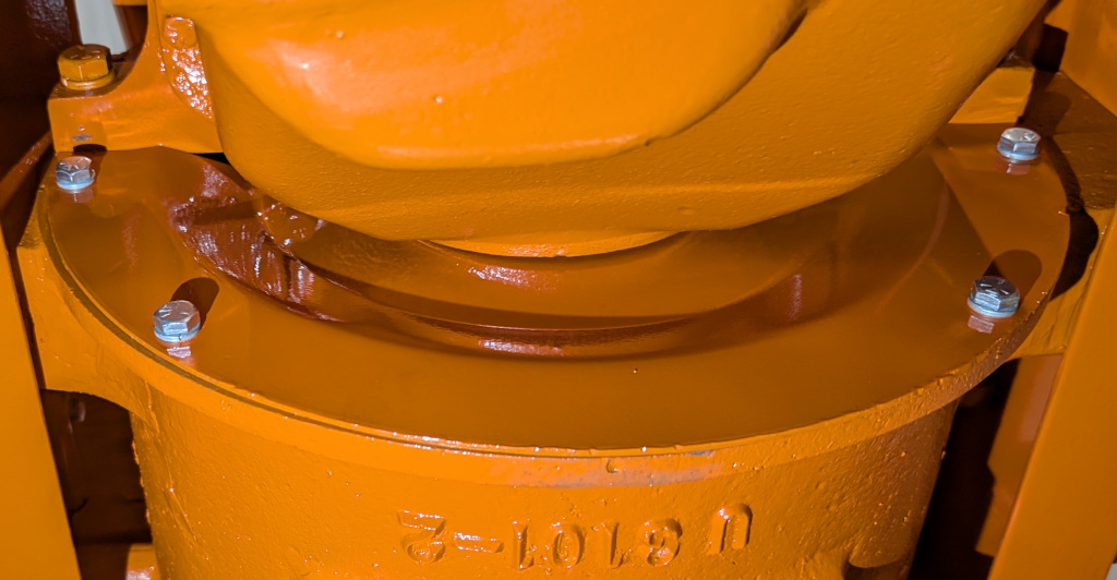 The shop hoist lowered the engine into its place and it's bolted securely to the clutch housing